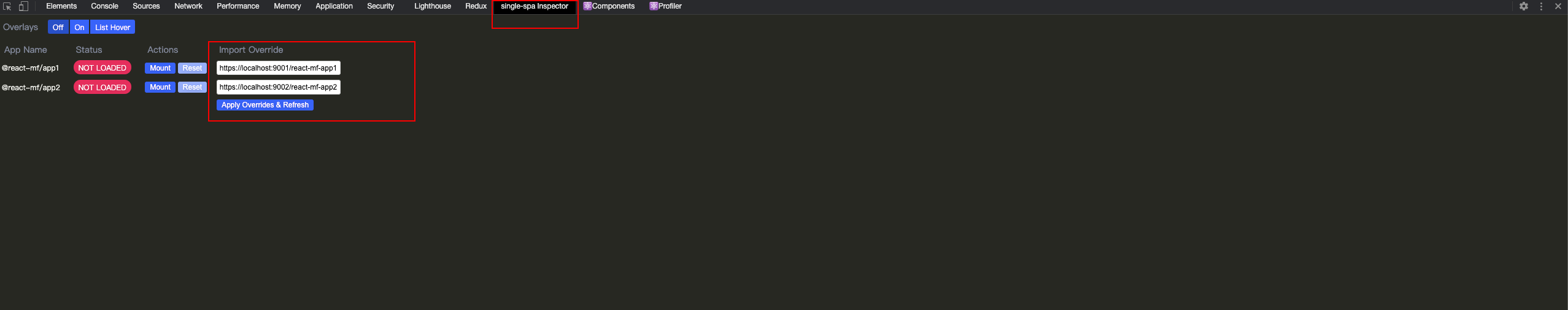 安装了扩展之后我们的 Chrome 控制台就会多这么一个 tab ,在这个 tab 下就能看到我们的子应用有哪些,初始 import override 那是没有配置的,这里根据我们自己的子应用做一个配置就行,上面就是我的配置,到这里算是完成了,我们切换路由就可以看到对应的子应用了。